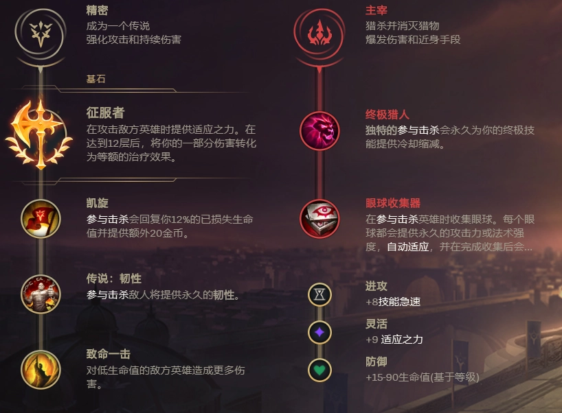 在大乱斗模式中,暴击流德玛的出装与天赋搭配和传统肉坦路线存在明显差异。这套玩法的核心天赋是征服者——借助德玛的E技能能够快速叠满征服者层数,从而大幅提升他的持续输出与作战能力。第二栏天赋推荐选择凯旋,利用助攻回血的效果间接增强德玛的生存续航;第三栏则优先点出韧性,这是重装战士类英雄普遍需要的属性;最后一栏搭配坚毅不倒,进一步强化德玛在残血状态下的反杀潜力。