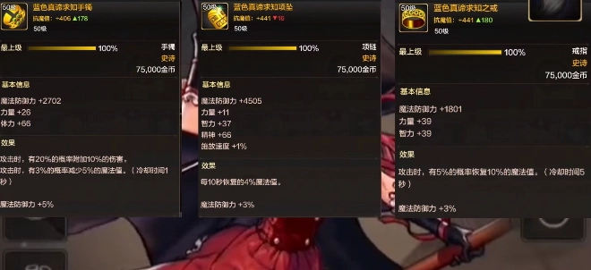 首饰搭配上,悲鸣套装堪称百搭之选。这套50级的悲鸣首饰属性相当实用,足以应对大多数使用场景——不仅能为输出提供一定数值的增幅,还能全面强化各项属性,同时涵盖物爆、魔爆等加成,此外还有生命值提升、速度加成以及魔法值增加等实用效果。