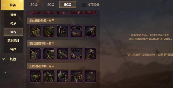 在游戏前期阶段,角色等级提升至50级前,每达到一个整十级(即10级、20级、30级、40级)时,都能领取包含角色装备的丰厚大礼包。0到30级期间,依靠这些礼包内的装备来挑战副本(刷图)是完全足够的;当角色等级达到30级后,便可以解锁并进入远古地图进行征战,游戏中期的装备大多是从这些远古地图的征战玩法中产出的。其中,战争之王系列装备分为30级、40级、50级套装以及55级真套装,55级真套装需要通过在遗迹副本中获取特定材料来进行制作。而到了游戏后期,装备选择上推荐以50级史诗装备作为主要搭配的首选。