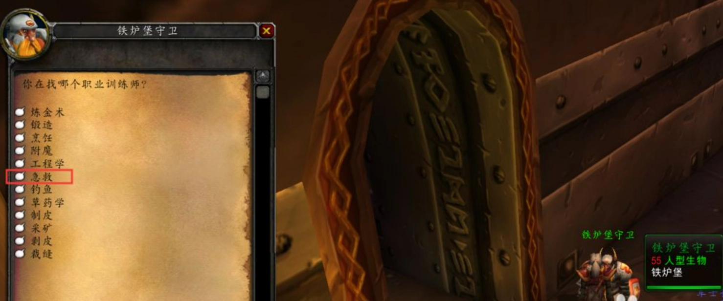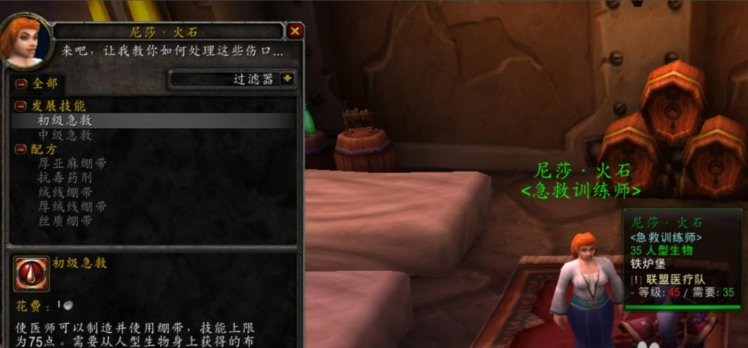 负责急救这个职业的训练师是尼莎·火石,找到她后点击找到发展技能这一块,就可以学习初级急救和中级急救了。