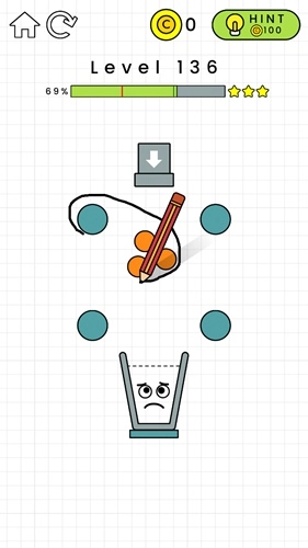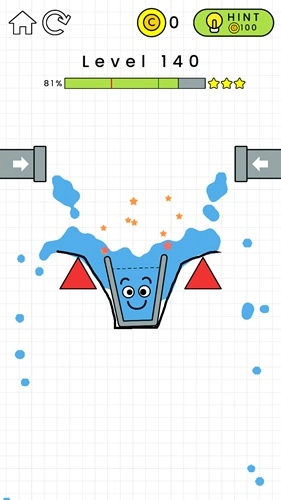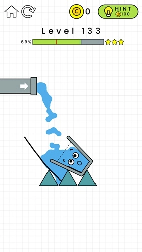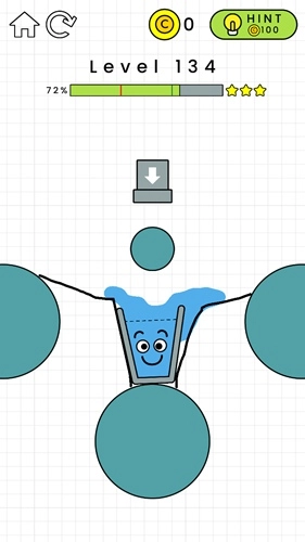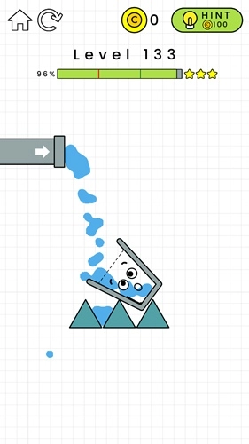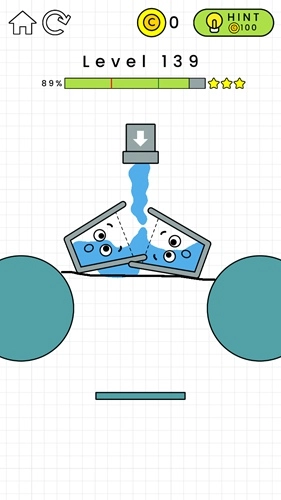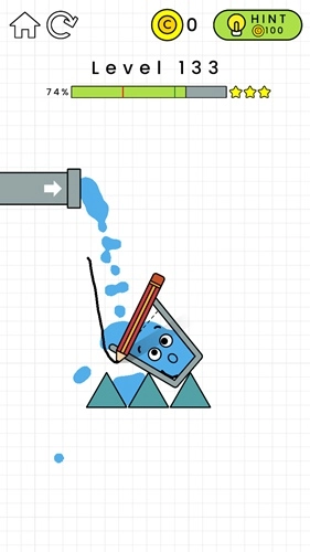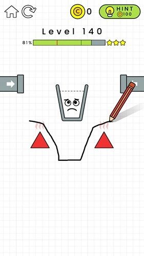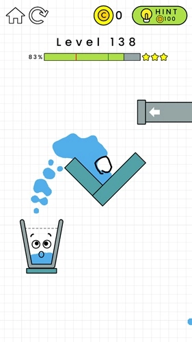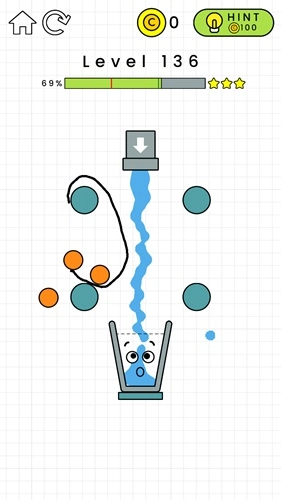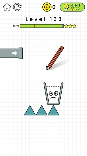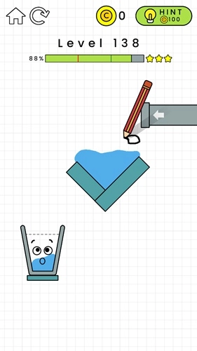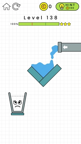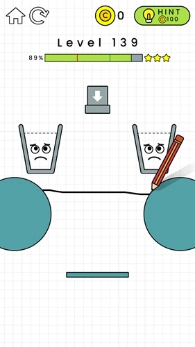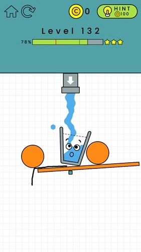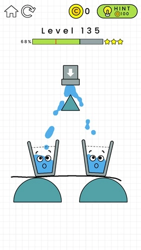 第132关:在黄色横条的左边画一个倒L形,这样能给左侧增加重量。杯子掉下来后要能维持一小段平衡时间,不用特别精准,只要别一下子就掉下去就行,之后水就会自己把杯子装满了。