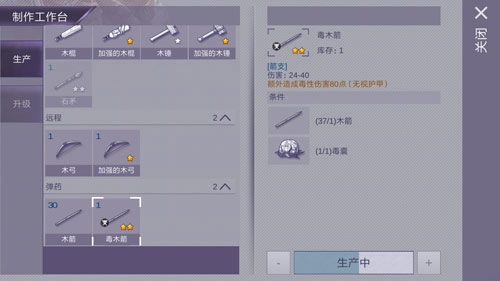木箭能直接在工具台用木头制作,毒囊得去森林里打爆炸甲虫才能获取。