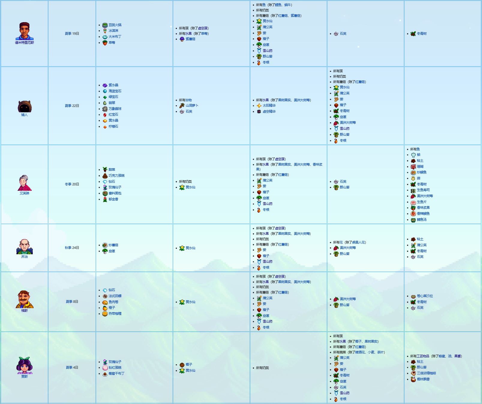 以上就是小编整理的星露谷物语NPC喜好表格,里面涵盖了每位NPC的偏好与讨厌物品说明,玩家可依据这些内容挑选合适的礼物赠予NPC,以此提升好感度,更好地体验游戏乐趣。不过送礼并非与NPC互动的唯一途径,大家还能通过日常对话、参与节日活动,或是在新版本中邀请NPC一同观影等方式,加深彼此的了解与情感联结。
