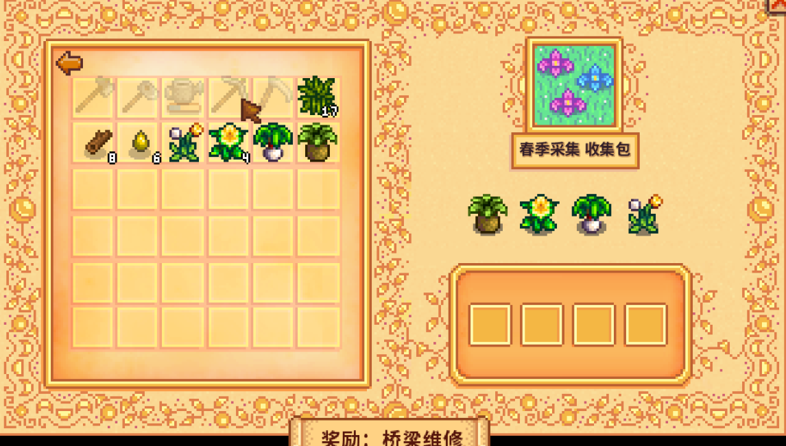 值得一提的是在第一个采集完成的春季采集包收集完之后,社区中心就会开启其他的收集包。