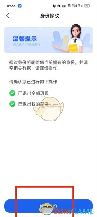 4、随后进入身份修改页面,完成两项操作后,点击【修改身份】即可。