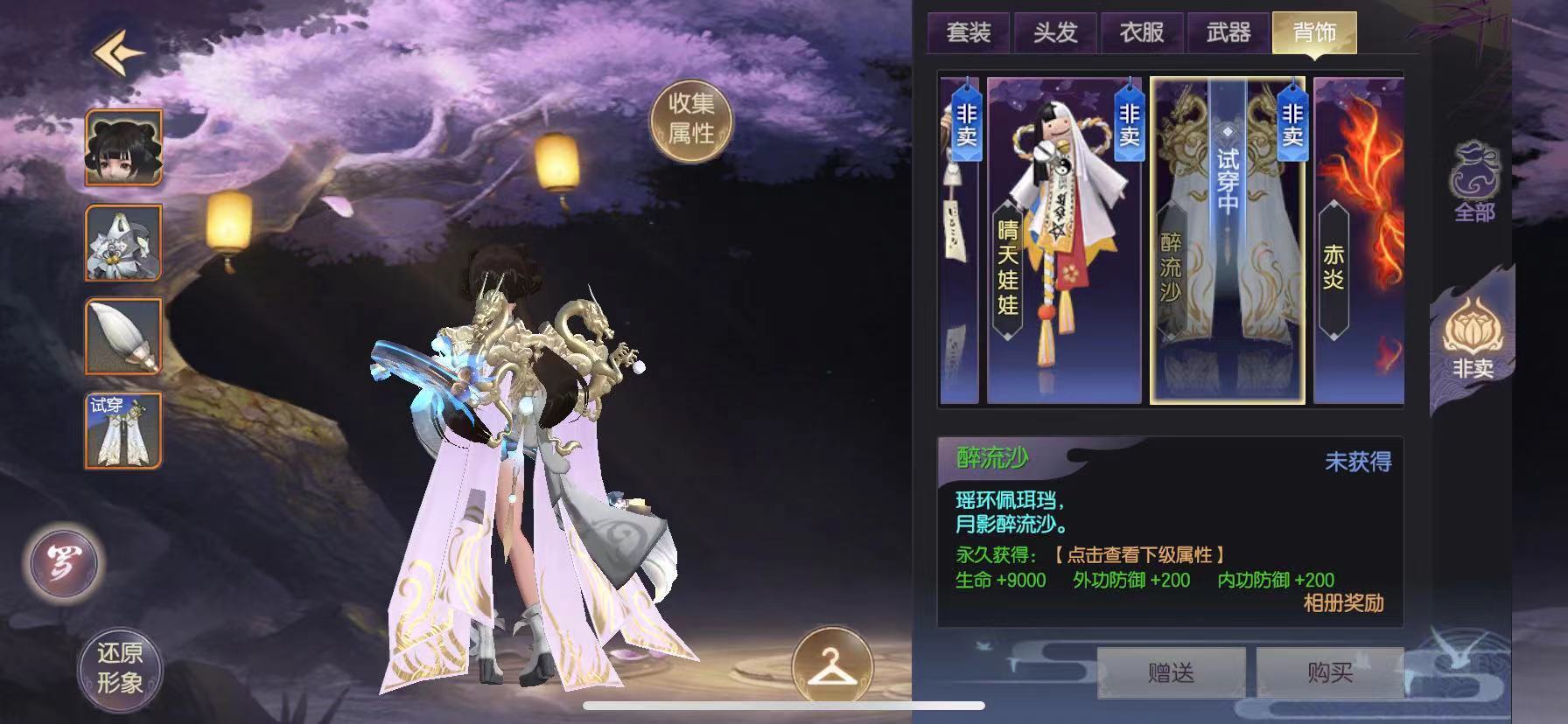 游戏里的时装同样分为头发、衣服、武器和背饰四个部分,每个部分都不可或缺。醉流沙就属于背饰中的一款,它无法用元宝或银币购买,玩家只能通过完成任务来获取。