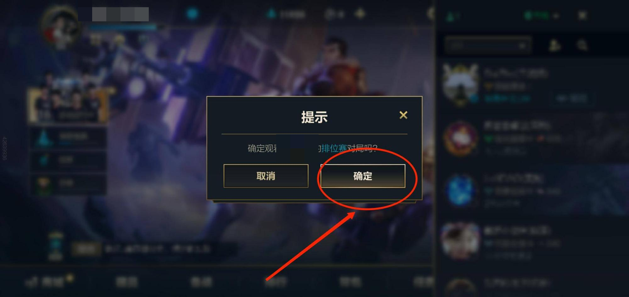 首先,玩家需先进入游戏,找到游戏主界面右侧的好友列表并点击;接着在列表里选中想要观战的好友,点击该好友右侧的【观战】按钮;之后在弹出的页面中点击【确认】,进入游戏对局的加载界面;等加载完成后,就能观看好友的这场比赛了。