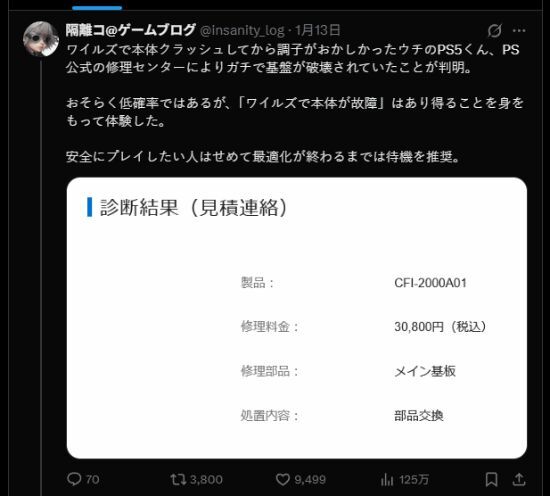 日本网友隔離コ@ゲームブログ所使用的PS5是2024年推出的轻薄版本(Slim),在一次《怪猎荒野》游戏崩溃后,主机就出现了异常状况。经PS官方维修中心检测确认,主板已被烧坏;不过在此之前,主机的摆放位置和防尘措施都做得很到位,且在运行该游戏发生崩溃前,主机本身也没有任何异常表现。