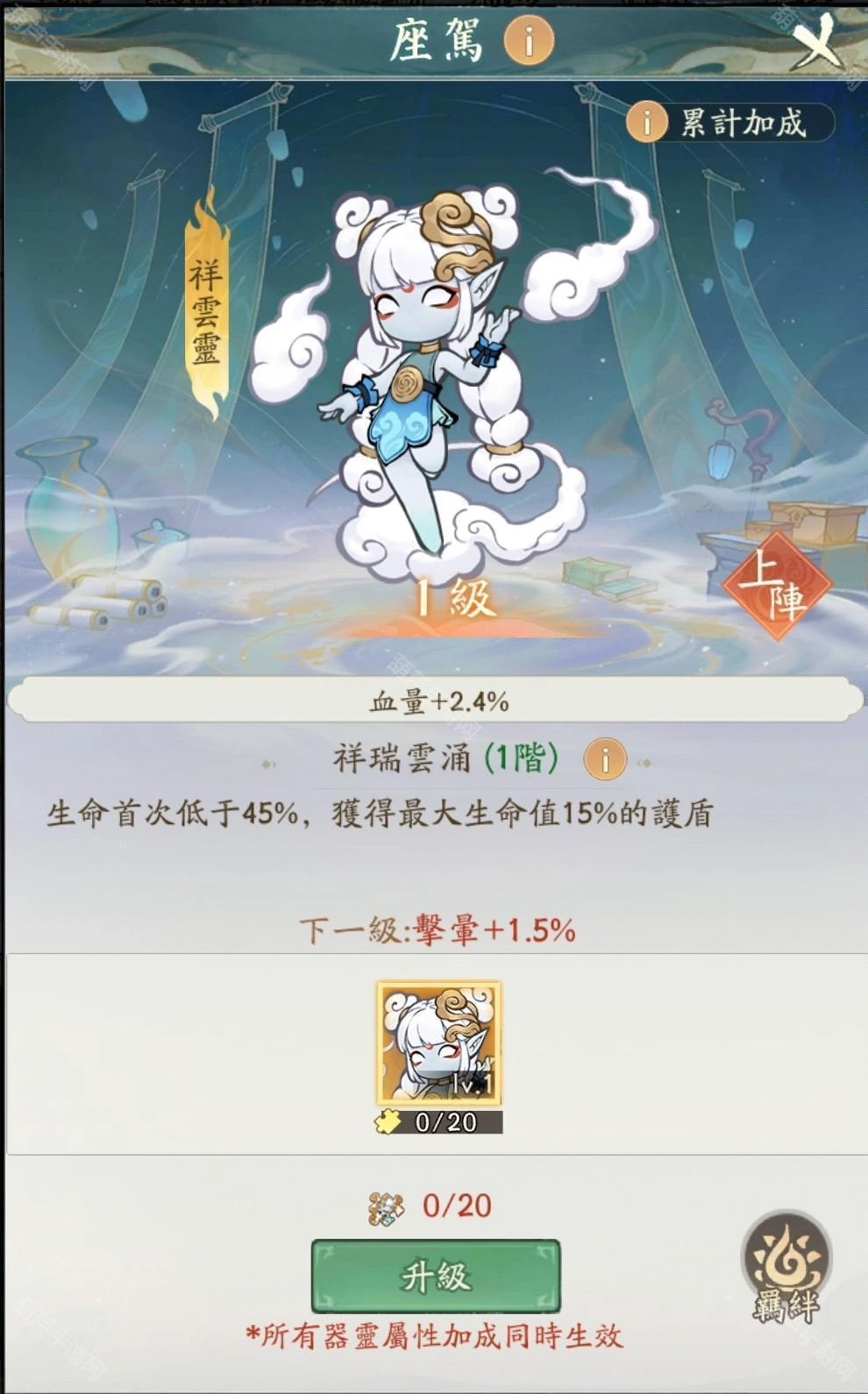 座驾器灵目前加成分为三块:属性加成、独立技能、羁绊加成