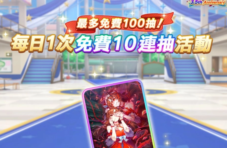 活动期间内,只要每日登录游戏,就能在正在进行的3.5thAnniv.支援卡片转蛋[抽10次!]活动中,每天享受1次免费抽奖机会,累计最多可获得100次免费抽奖资格。