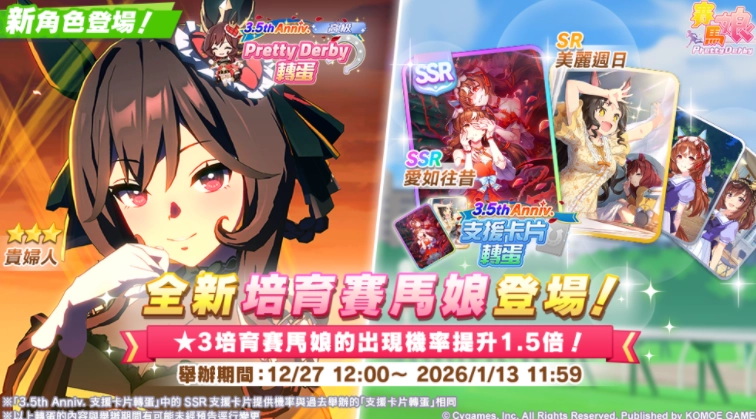 在「3.5周年高级PrettyDerby转蛋」活动里,★3培育赛马娘的出现概率是「特选PrettyDerby转蛋」的1.5倍。