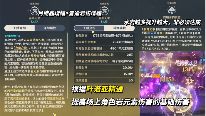 - 剧变增幅:队伍中每有1/2/3名水或岩角色,额外基于叶洛亚元素精通提升伤害。其中对月结晶伤害的提升极高(最高可达160%精通加成)。