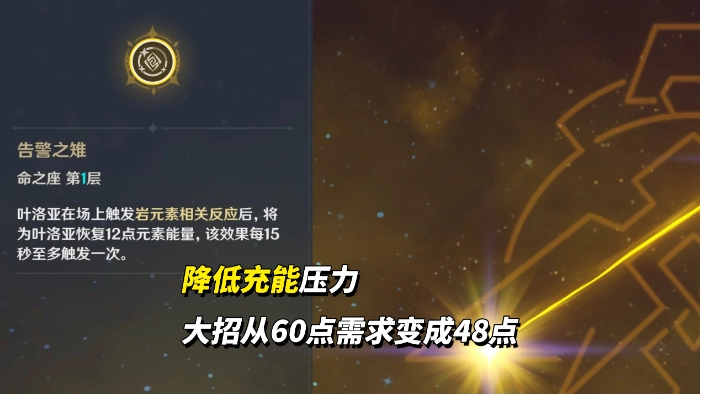 1、1命(完全体):叶洛亚在触发岩元素伤害后,会恢复12点元素能量。由于她的元素爆发需要消耗60点能量,这一命座能显著减轻充能方面的压力。
