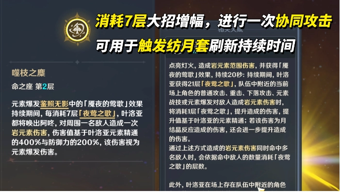 2、2命(质变效果):在元素爆发持续期间,每当消耗7层「夜莺之歌」,叶洛亚就会造成一次单体伤害,该伤害基于自身400%的元素精通与200%的防御力计算。这是她仅有的后台脱手伤害手段,同时还能延续特定圣遗物的增益效果。