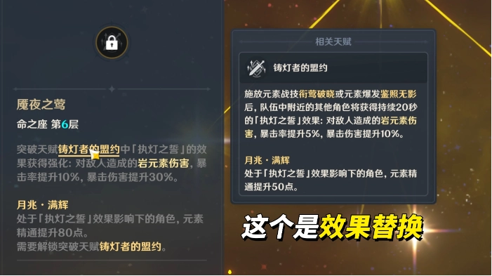施放战技或元素爆发后,会赋予全队持续20秒的增益效果:岩元素伤害提升,暴击率增加5%,暴击伤害提高10%。当角色处于月兆·满辉状态时,还将额外获得50点元素精通加成。