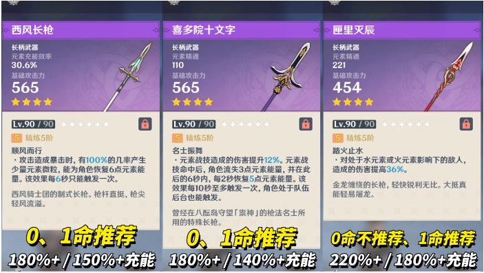 :推荐0命使用,需堆暴击触发特效,充能需求180%+(0命)/150%+(1命)。