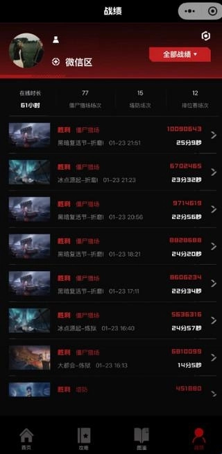 3、按照提示完成角色绑定后,点击界面右下角的【战绩】选项,就能查看每张地图对应的参与次数以及时长记录了。