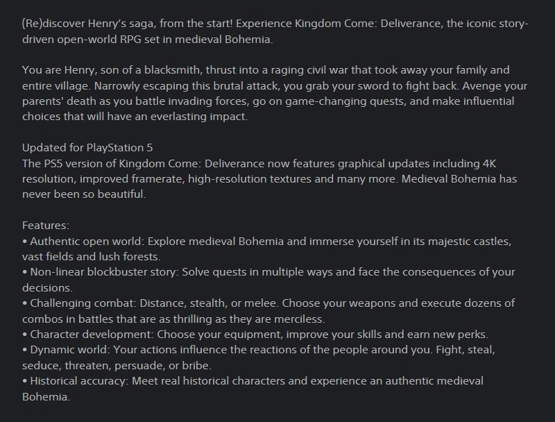 尽管战马工作室去年曾透露暂时没有回归初代作品的计划,但目前的一些迹象显示,《天国:拯救》或许很快会推出本世代主机的强化版本。根据Gematsu的报道,这款游戏在PlayStation商店的列表介绍里已经悄悄进行了更新,新增了“已为PlayStation 5更新”的标注。