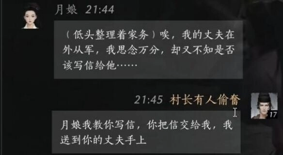 玩家:月娘,我来教你写信,等你写好后把信给我,我帮你送到你丈夫那里去。