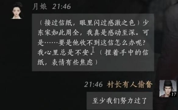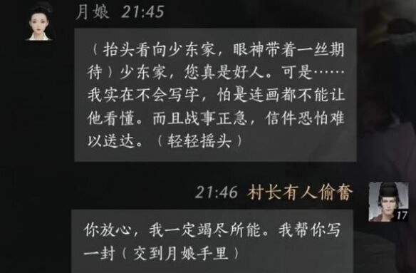 玩家:你尽管放心,我肯定会竭尽全力。我帮你写一封信(交到月娘手中)。