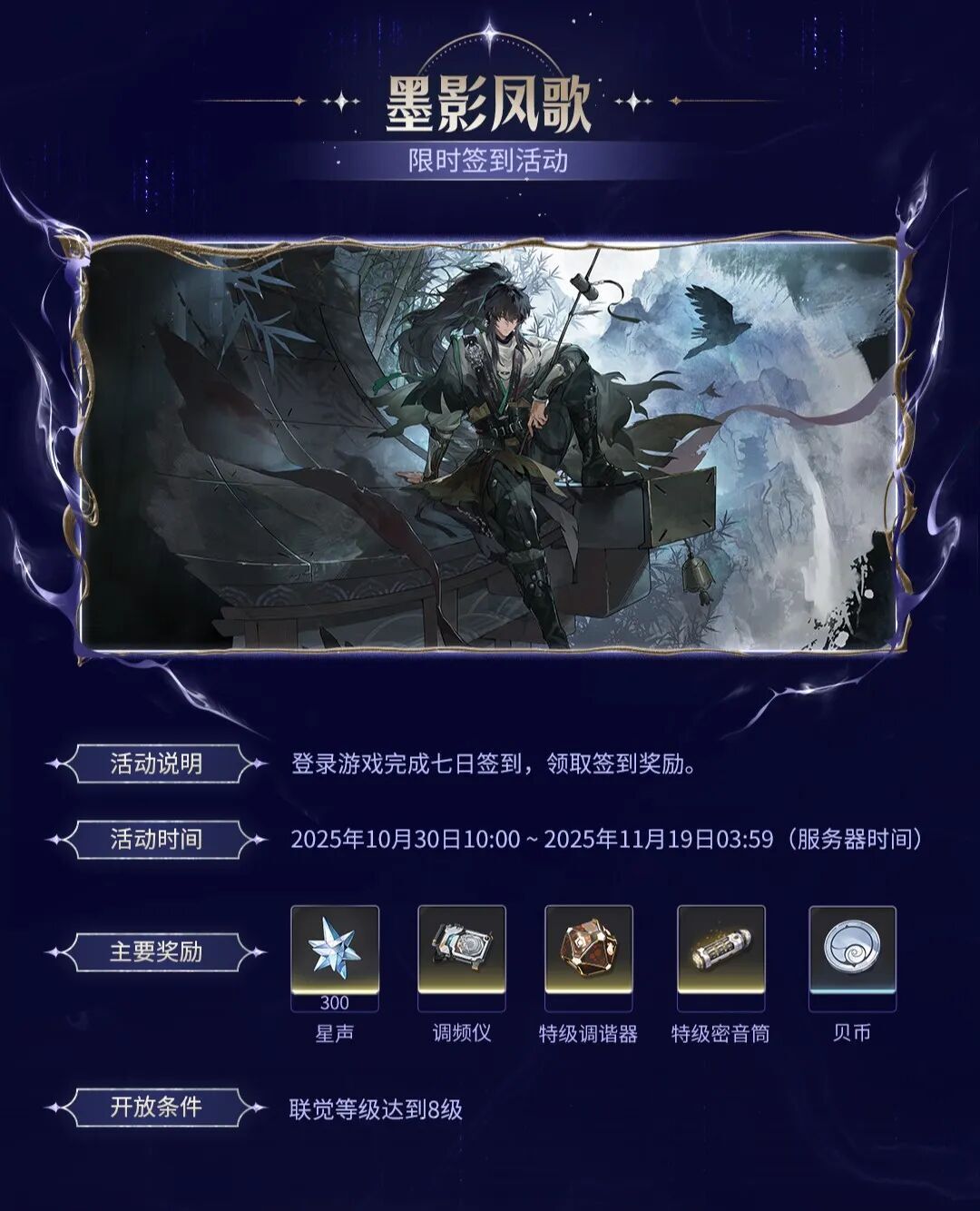 随着2.7下半版本的开启,除了五星角色仇远与赞妮的up池上线外,签到新活动【墨影凤歌】也将同步开启。只要连续七天完成签到,就能获得300星声等奖励,这个福利还是相当不错的。