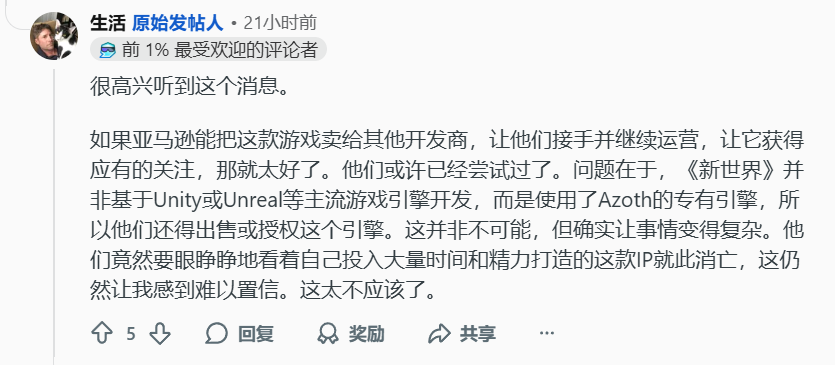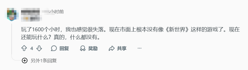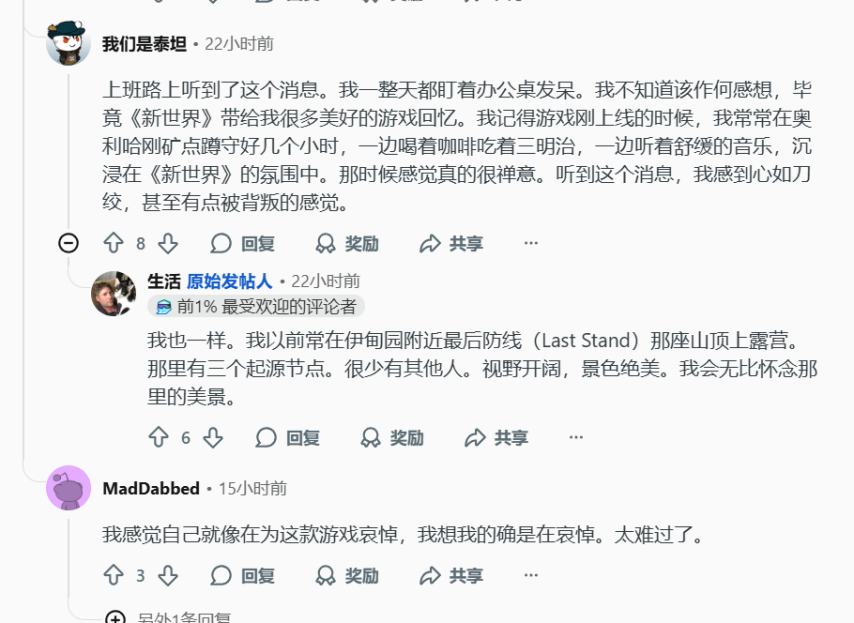 许多在《新世界》中投入大量时间的玩家,也都在这篇帖子下方表达了自己的悲伤之情,指责亚马逊的草率决定。