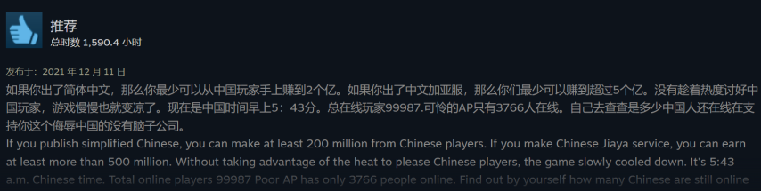 这么说吧,这个游戏既没有亚服也没有中文,添加翻译插件还会被封号,但依然有不在少数的中国玩家,顶着高延迟和英文坚持玩,只因游戏太好玩了。