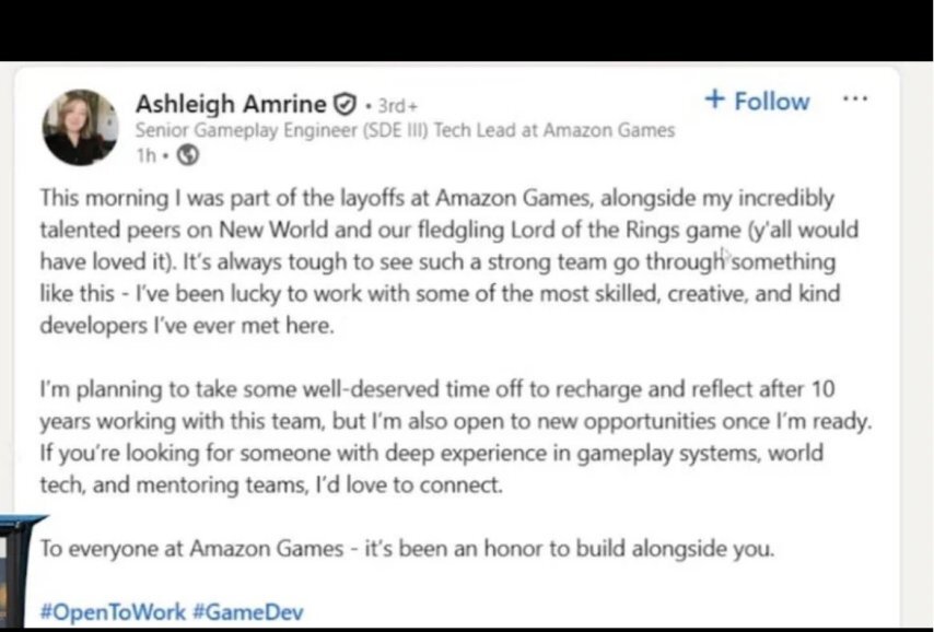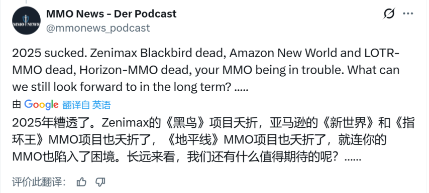 坏消息不止这一个,亚马逊游戏旗下那款已研发两年的《指环王》MMO,其项目负责人近日也发文表示自己和团队都被裁撤,这款备受期待的重磅IP作品基本已确定夭折。