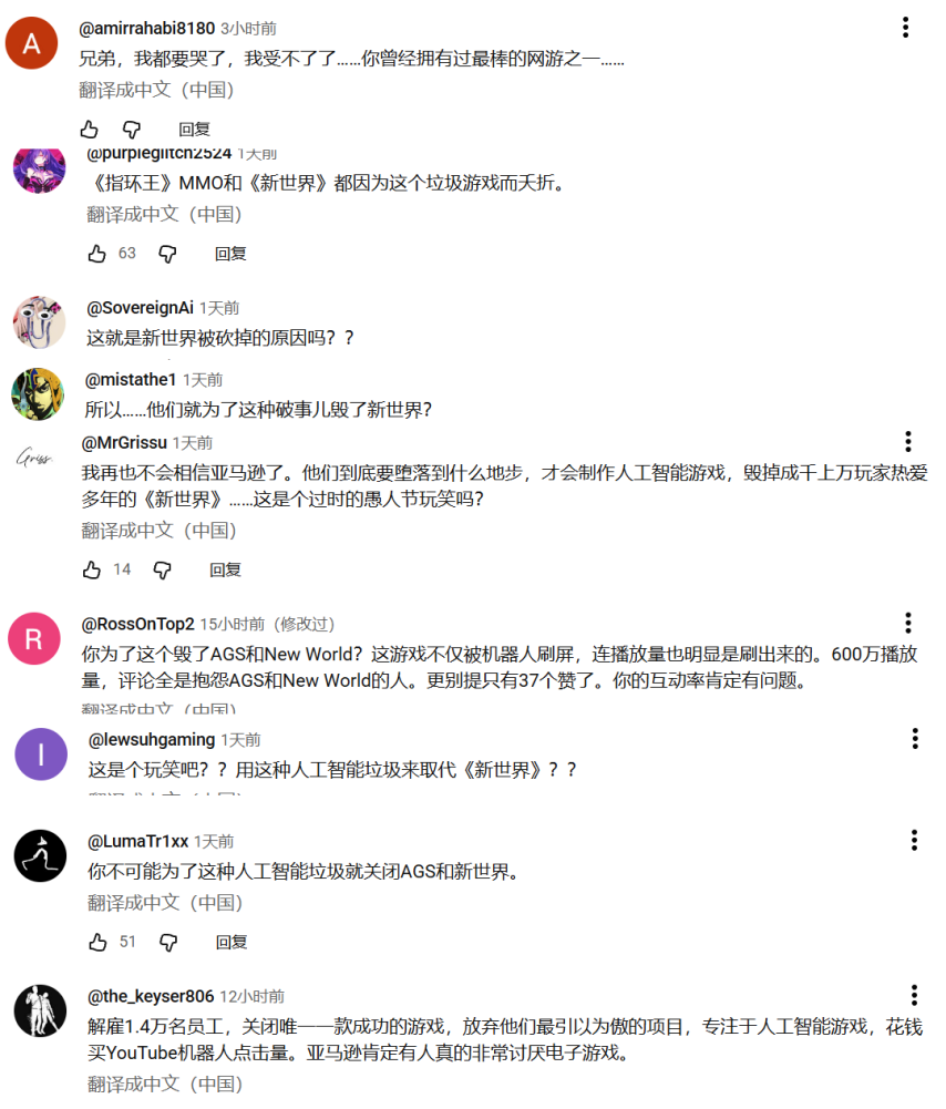 很明显,不少玩家无法接受《新世界》是因为这款游戏才停止更新的,于是纷纷在《Snoop Dogg》宣传视频的评论区愤怒指责,认为亚马逊仅仅为了这样一个东西就让1.4万人失去工作,还毁掉了他们所热爱的《新世界》。
