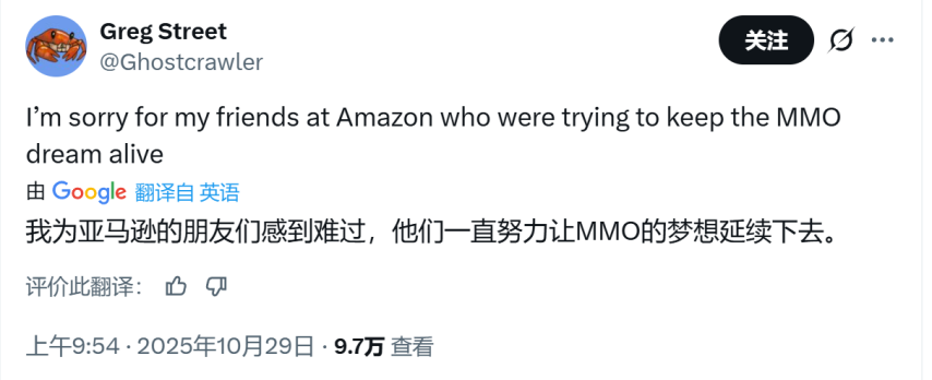 这种情绪也渗透到了行业内部,前《魔兽世界》设计总监Greg Street同样在X平台上流露了对《新世界》项目的惋惜之情。值得注意的是,他个人的工作室不久前刚遭网易裁撤,其正在开发的MMO游戏《Ghost》恐怕也会因此胎死腹中。