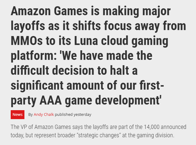 这时大家该好奇了,亚马逊是为了什么裁员1.4万,甚至不惜停更旗下投入数年、唯一成功的游戏产品呢?