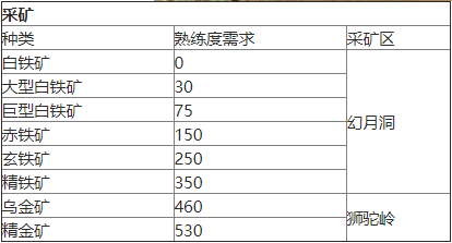 游戏里,当玩家角色等级提升到21级及以上时,就能前往东海村找坐标为(117,81)的铁匠王洪学习采矿技能。学会采矿技能后,先去杂货店购买矿镐并装备好,接着前往幻月洞寻找矿物;找到矿石后点击挖掘,等进度条加载完成,就能得到相应数量的矿石,同时采矿熟练度也会随之增加。不过,当熟练度达到当前等级的上限时,就无法再继续提升了,这时候需要再次找到铁匠王洪来升级采矿的阶数。一般来说,采矿熟练度越高,能够挖掘的矿石种类就越丰富;当熟练度提升到更高水平后,玩家还可以前往狮驼岭挖掘更高级别的矿石。