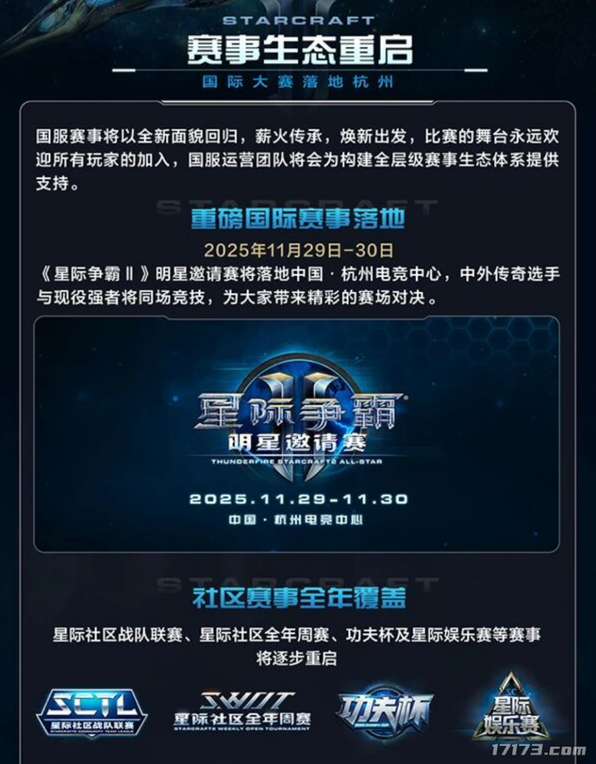 更让人感到振奋的是,网易雷火会同步重启《星际争霸2》的赛事生态。2025年11月29日到30日,杭州电竞中心将举办《星际争霸2》明星邀请赛,到时候国内外的顶尖选手会汇聚在这里,同时还会公布更多重要的消息。