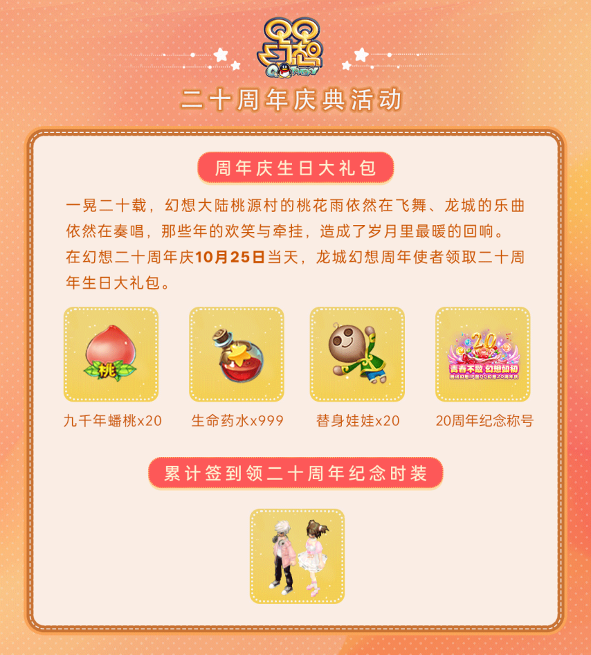二十年来时光飞逝,幻想大陆的每一处景致都承载着往昔的回忆。在10月25日周年庆典当天,等级达到30级及以上的玩家,可前往龙城坐标(271,103)处,找到【幻想周年使者】这一NPC,领取二十周年专属生日大礼包。礼包内包含九千年蟠桃20个、生命药水999个、替身娃娃20个,以及二十周年纪念称号。