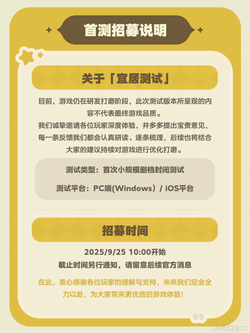 在《原神》《崩坏:星穹铁道》《绝区零》等作品风靡全球之后,米哈游又将触角伸向生活模拟赛道,带来了旗下首款田园生活模拟游戏《星布谷地》。官方今日发布消息称,该游戏的「宜居测试」定于2025年11月7日启动,此次测试面向PC端与iOS端,采取限量且删档的形式。
