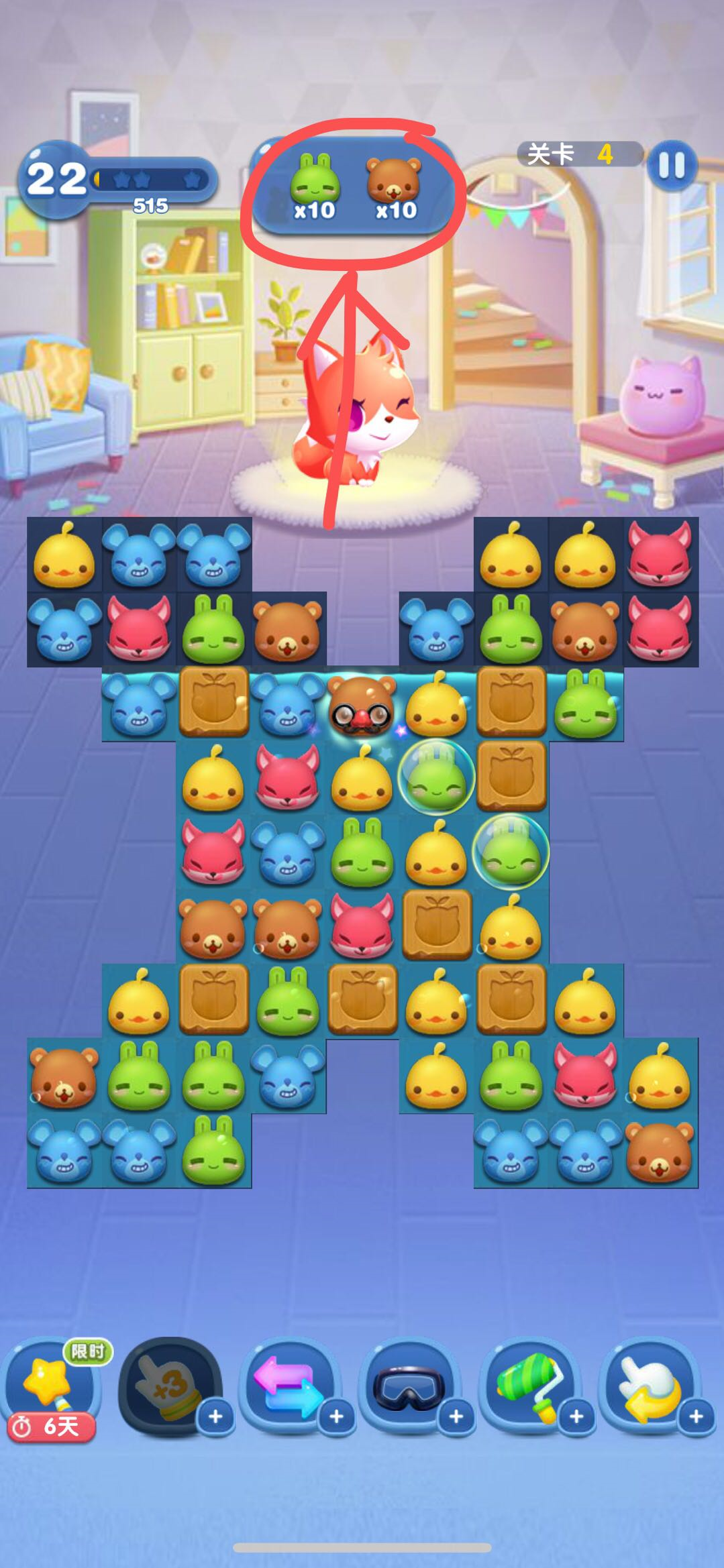 在游戏界面里,玩家得留意上方展示的通关要求,像图中的通关要求就是要消除10只兔子和10只熊,用越少的步骤完成关卡任务,能获得的分数就越高。