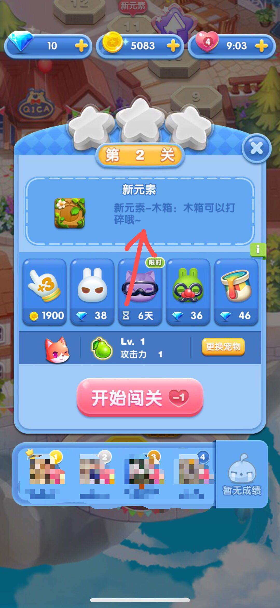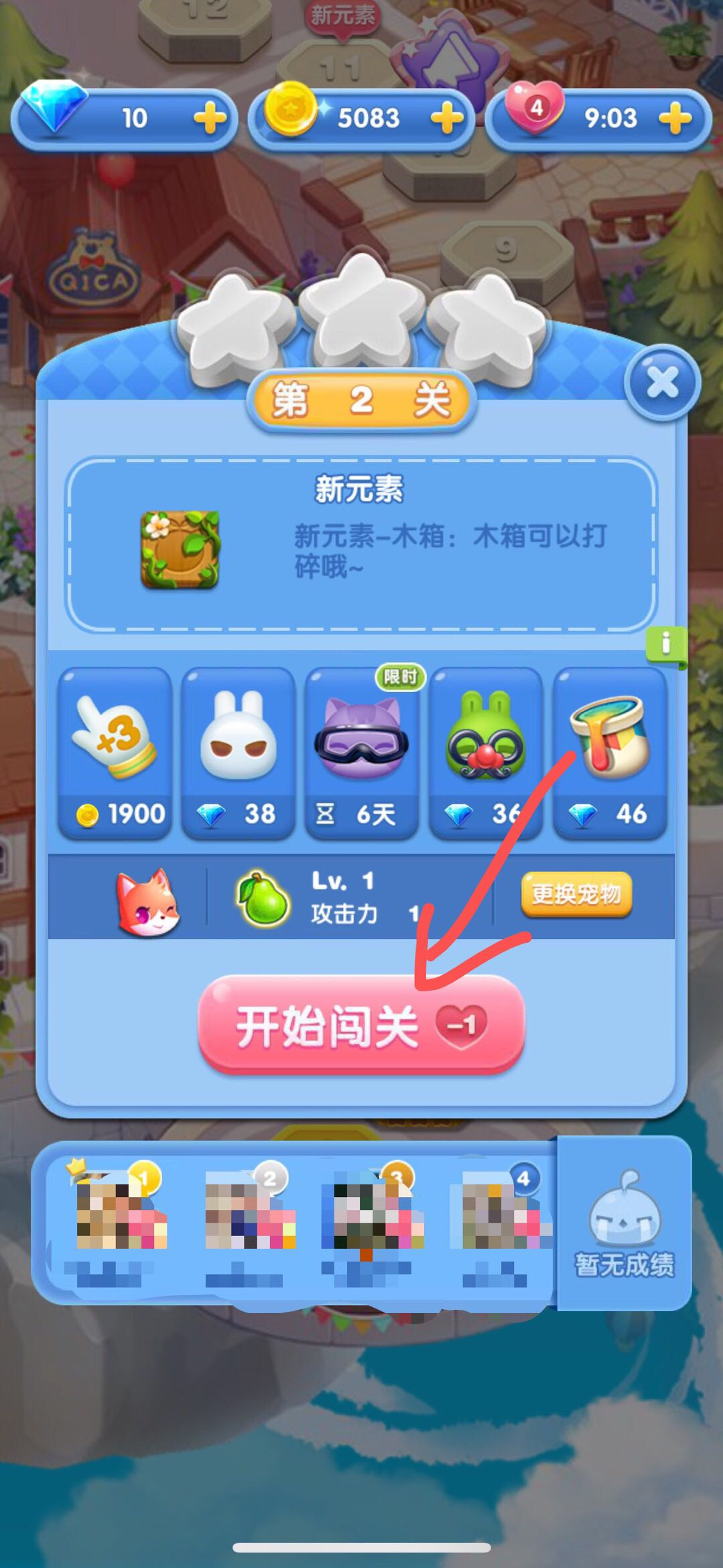 点击开始闯关就会消耗一定数量的爱心,进入游戏开始闯关了。