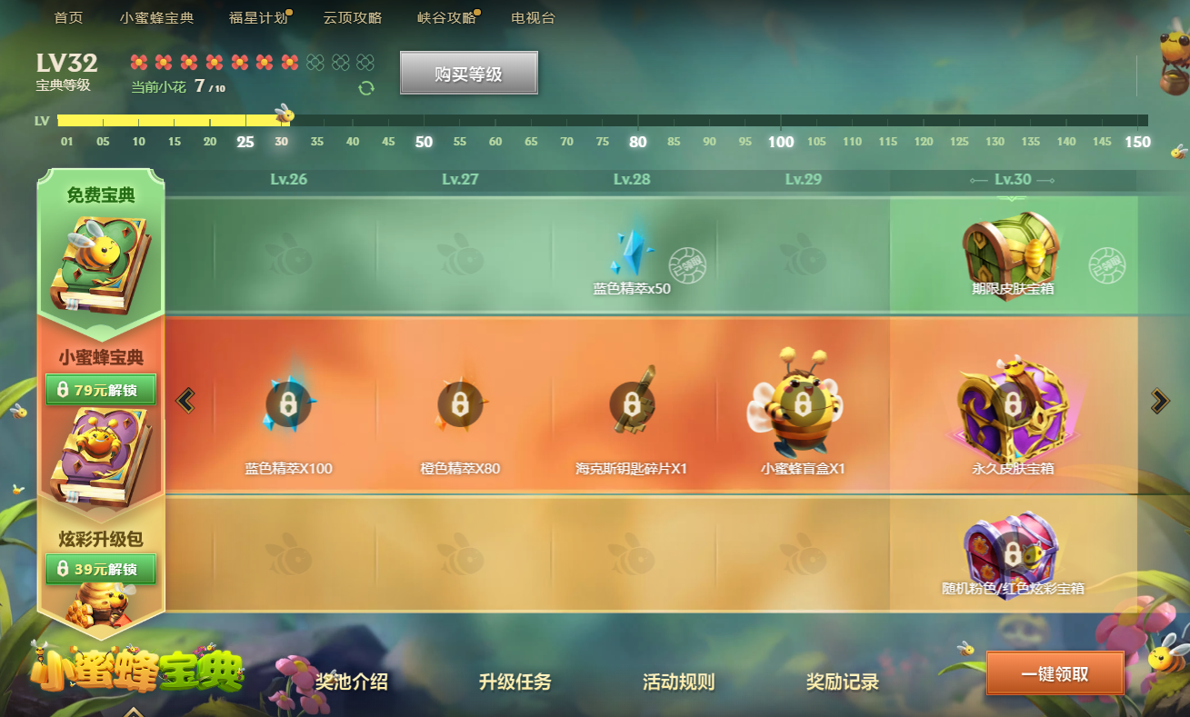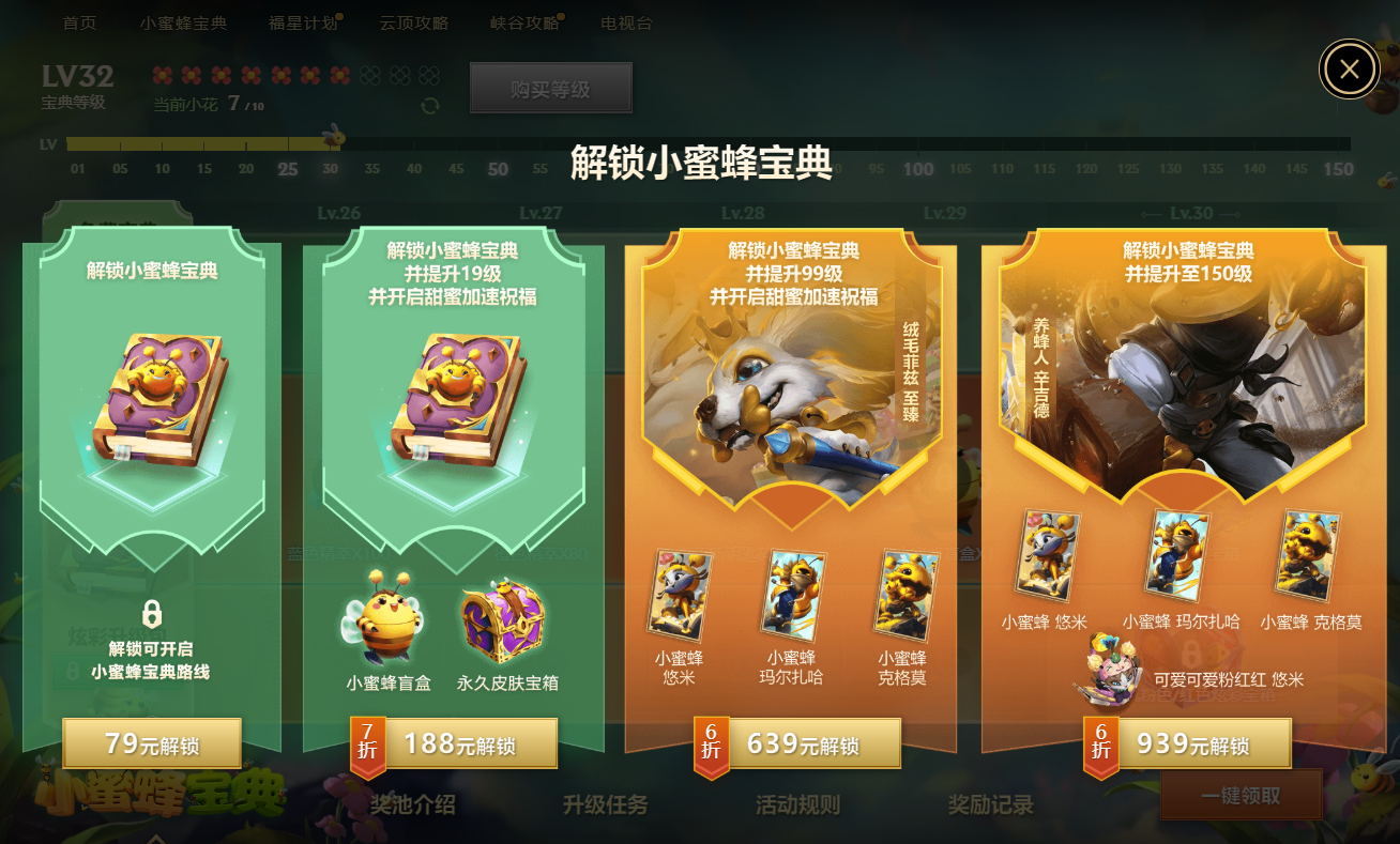购买小蜜蜂宝典有三种价格选择:188元可直接提升19级并开启甜蜜加速祝福;639元能直接提升99级,同样享有加速祝福;最高价格939元可解锁宝典并直接满级150级,获得活动全部奖励,还比其他档位多一个粉色炫彩的悠米皮肤。不过不太建议大家购买这个最贵的档位,价格偏高且性价比一般,平民玩家通过正常游戏就能获取奖励。