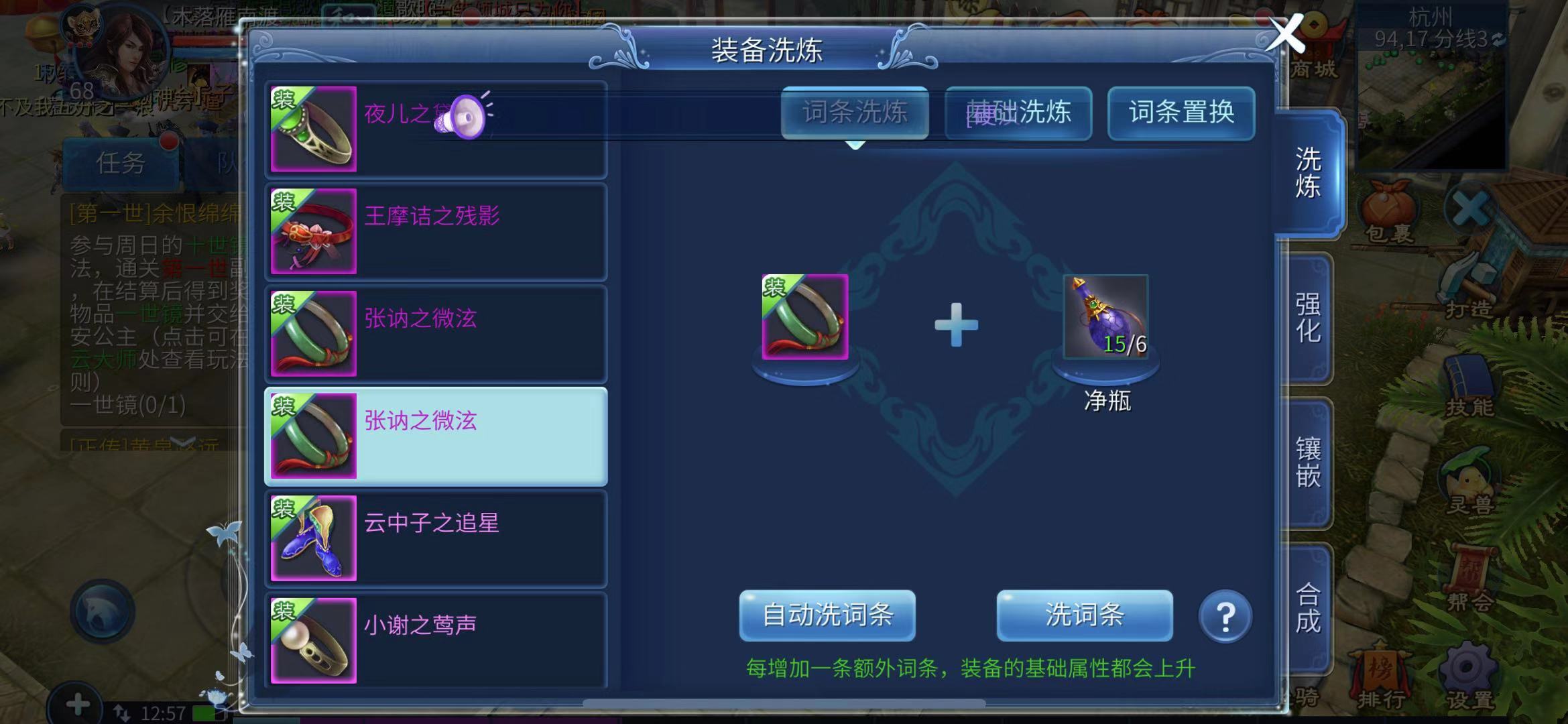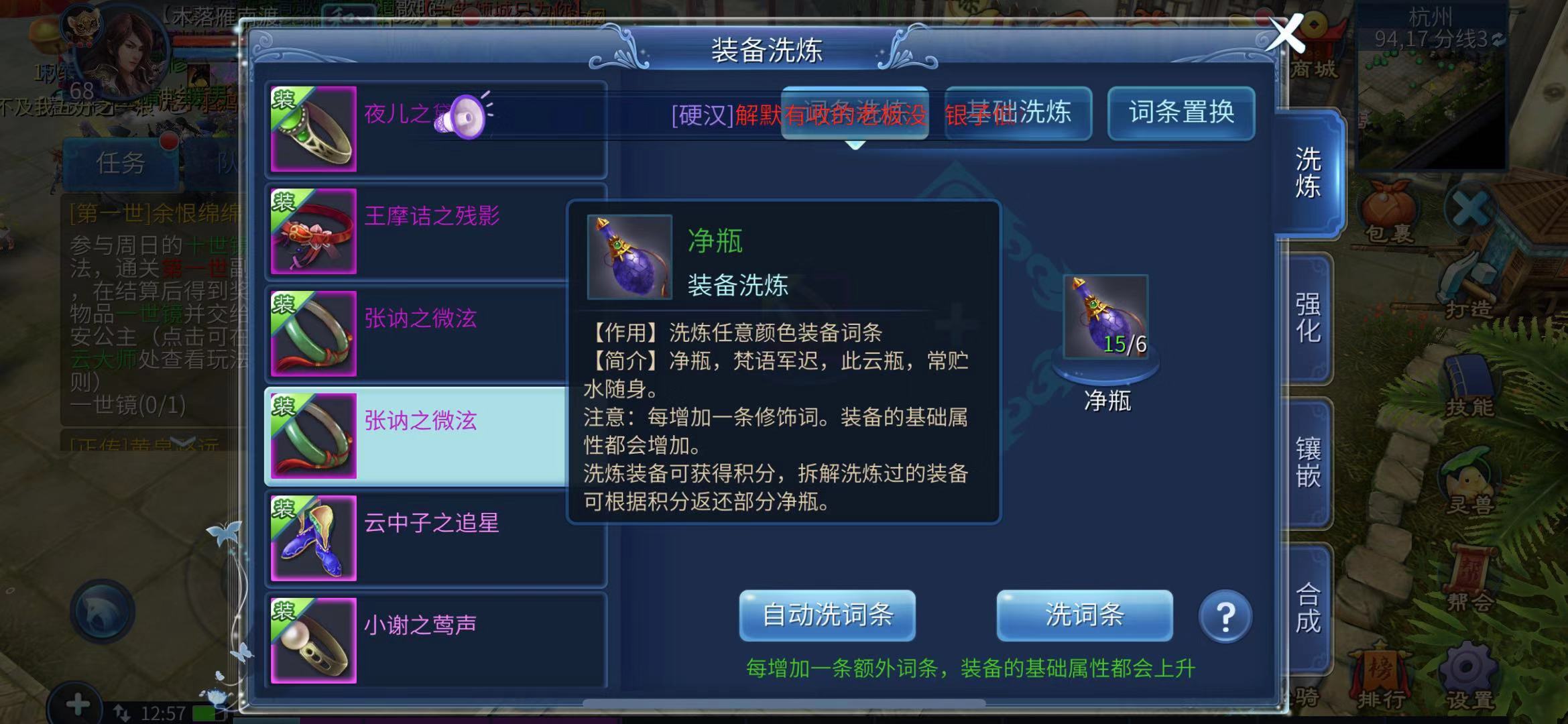 洗炼装备得用净瓶,要是想给装备洗出指定的极品词条,还得靠不错的运气和一大堆洗炼道具才行。洗一次装备要两个净瓶,像“会禄”这种词条,不洗个几十上百次基本很难出,玩家得攒好多净瓶,不过净瓶的获取途径还挺多的。