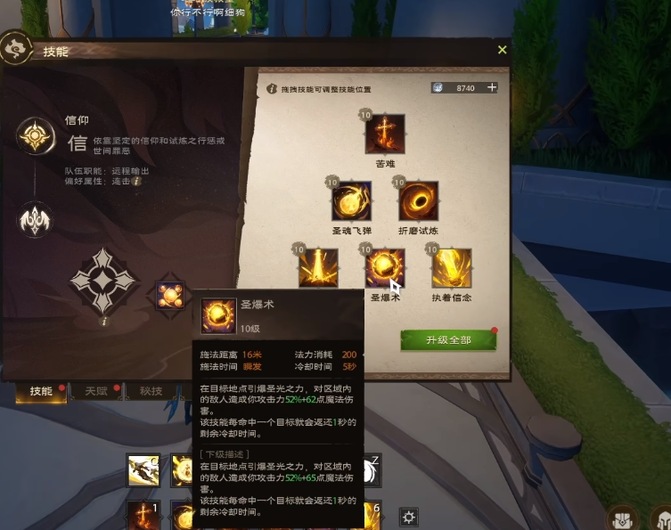 5技能圣爆术:向目标区域引动圣光之力并引爆,对范围内敌人造成攻击力52%附加62点的法术伤害。该技能每命中一个目标,即可返还1秒剩余冷却时间。其法力消耗为200点,冷却时长5秒。推荐天赋方面,可选择“所有技能基础法力消耗降低2%”与“技能连击时额外回复4点法力值”;此外,“强化圣爆术”天赋也值得考虑,它能让圣爆术基础伤害提升5%、基础法力消耗降低5%——推荐此天赋的核心原因,在于圣爆术本身法力消耗较高。