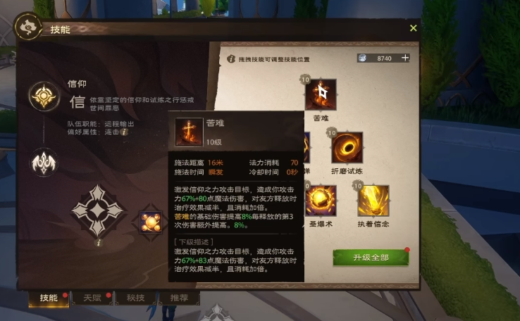 这个角色共有6个技能,依次为苦难、圣魂飞弹、折磨试炼、圣能进发、圣爆术和执着信念。其中1技能“苦难”的具体效果如下:施法距离为16米,法力消耗70点,能够激发信仰之力攻击目标,造成相当于自身攻击力67%加上80点的魔法伤害;若对友方释放,治疗效果会减半,且法力消耗加倍。该技能存在特殊机制:基础伤害会提升8%,并且每释放到第3次时,伤害会额外提高。在天赋选择方面,推荐以下几个强化方向:- 强化苦难:可使苦难的基础伤害提升8%,同时每次释放到第三次时,伤害额外提高8%;- 灵魂烙印:技能每次造成伤害并形成连击后,能让自身在接下来8秒内攻击力提升0.33%,此效果最多可叠加3层;- 赎罪:苦难命中敌人时,有15%的几率让目标在后续8秒内持续受到1.6%的魔法伤害。需要说明的是,这些天赋都属于强化技能类的天赋。
