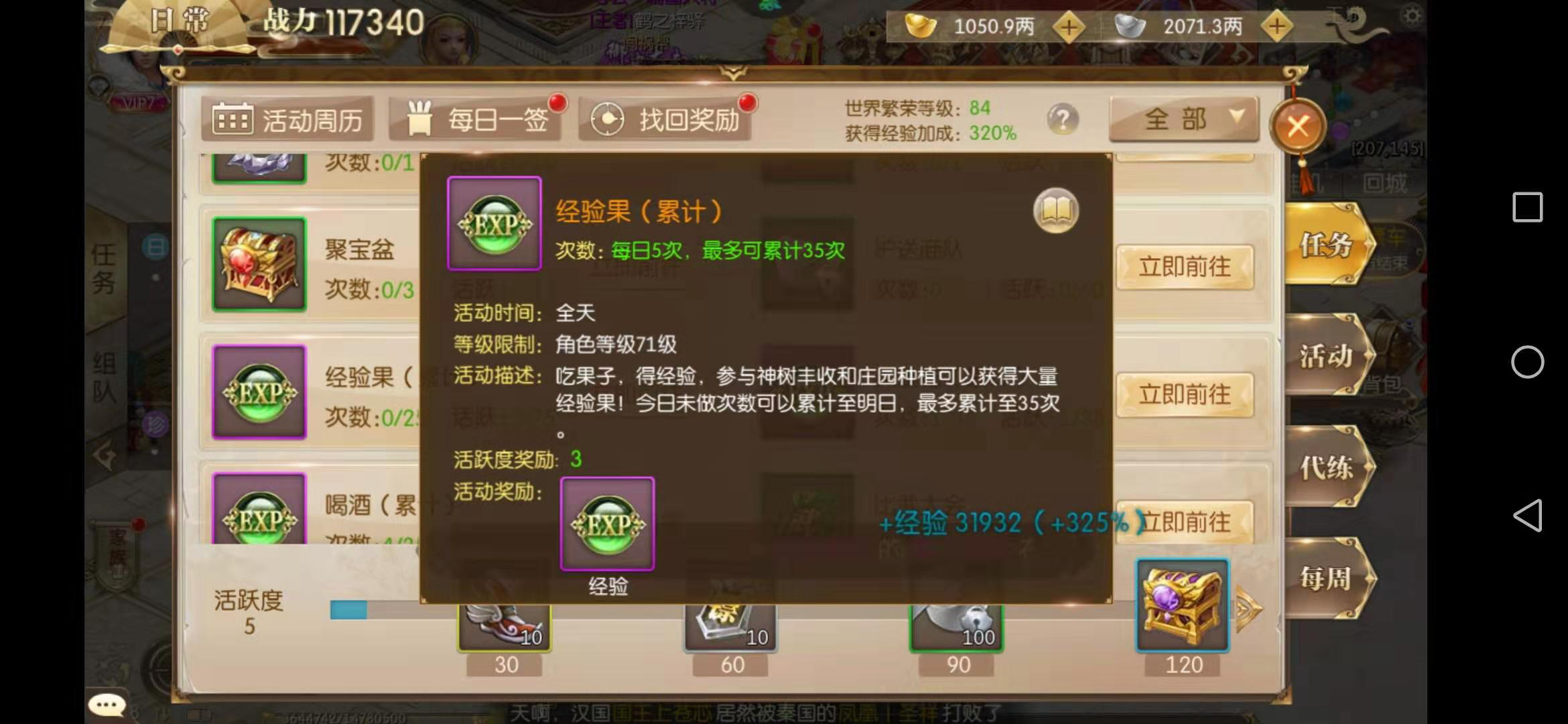 另外,在家族活动里,还能参与家族种植活动来培育家族果树。每天20:30的时候,家族果树会掉落大量猕猴桃,猕猴桃的品质由家族果树的状态决定。如此一来,每天获取的猕猴桃完全能够合成绿色品质,带来的经验收益相当可观。