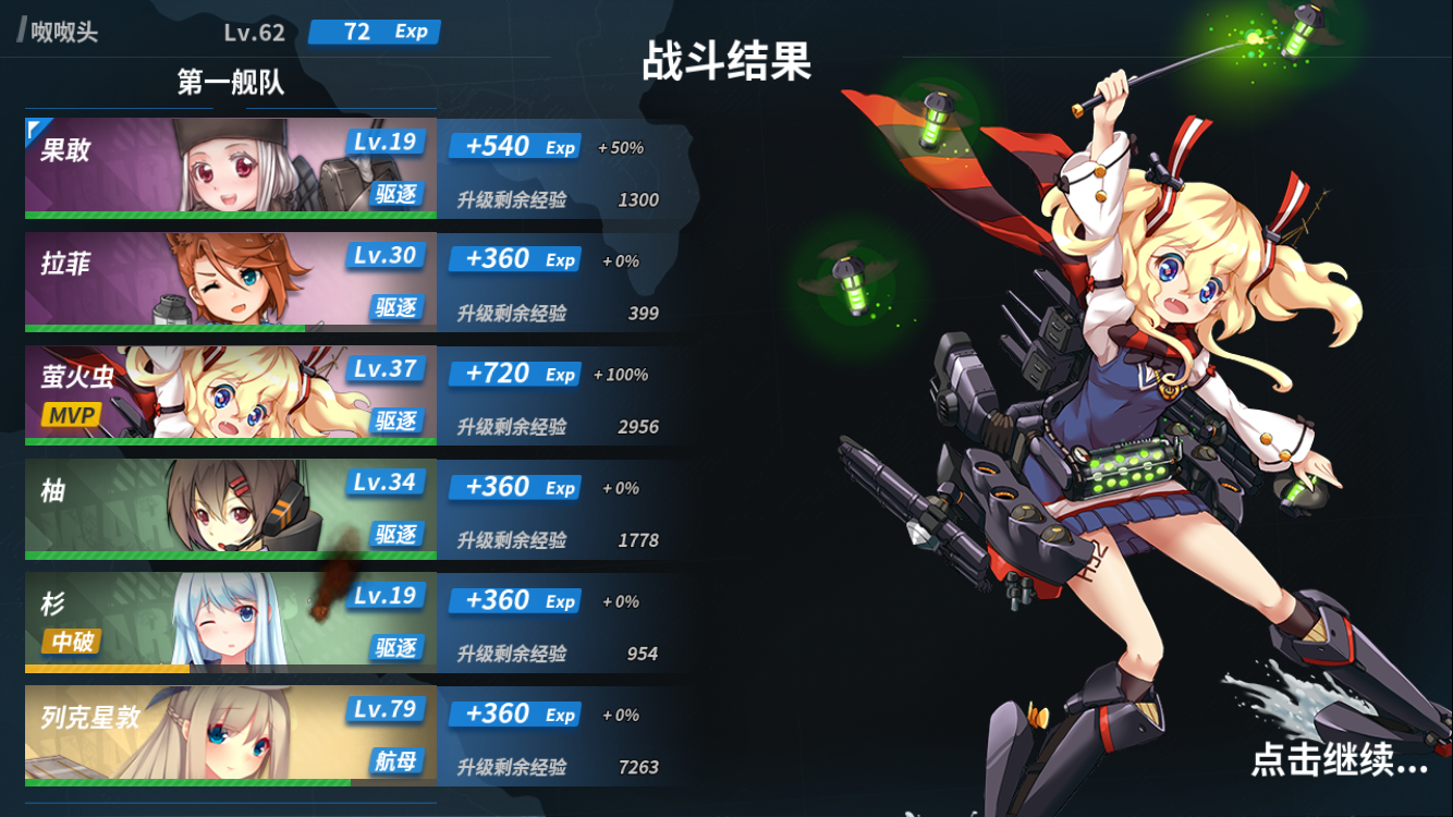 如下图所示,3-4A点果敢旗舰获得540经验,萤火虫720经验,其他船只都是360经验。