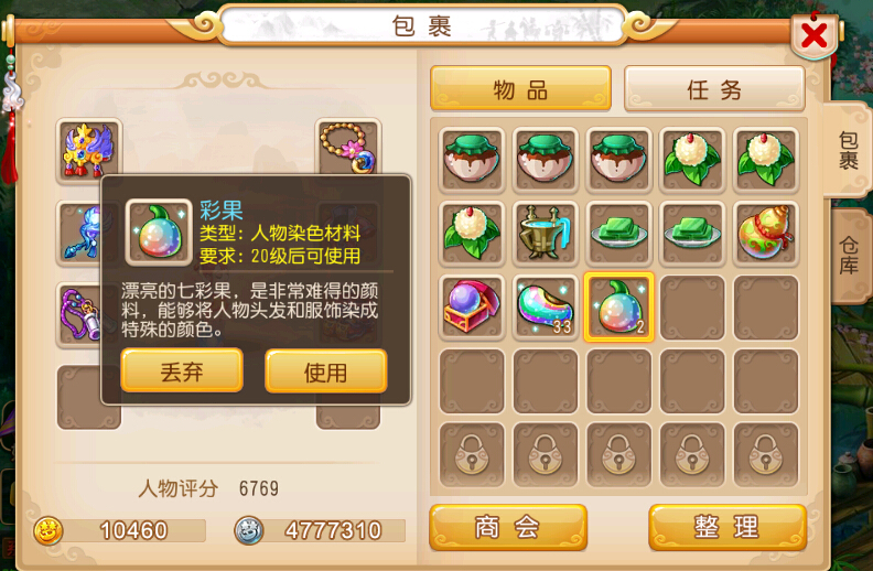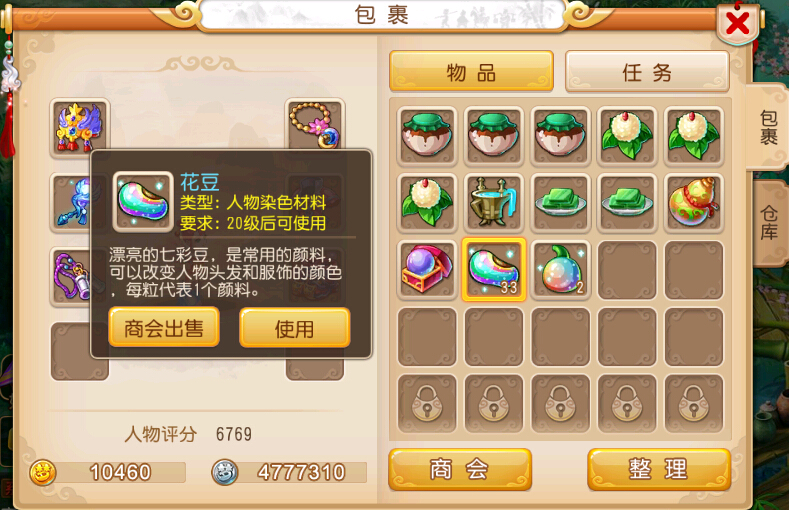 花豆是用于角色染色的道具,角色等级达到20级后即可使用。作为常见的染色颜料,它能改变角色衣服和头发的颜色,每粒可染一个部位的颜色。玩家可在长安城中找到配色师NPC使用花豆,自由选择心仪的染色方案。