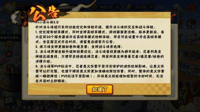 决斗场3.0版本马上就要和大家见面啦!这次的一系列功能优化简直让玩家们激动到按捺不住!接下来就让小编为大家带来火影忍者新版本的抢先爆料——新版本更新内容的详细解读!全新的决斗场版本热血来袭,值得期待!目前,官网已经正式公布安卓版本将于5月17日早上开启更新,早上八点之后各位玩家就能体验到最新版本了!