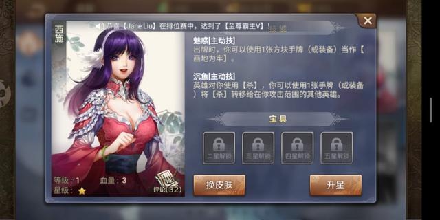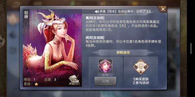 貂蝉属于稀有英雄,在英雄杀里拥有星级貂蝉的玩家并不多,宝具场里她也很难刷到。正因如此,这个英雄在经典局中实力很强,尤其是五人身份局。她的“诽谤”技能非常实用,要是你选她当主公,就能通过“诽谤”直接试探其他玩家的身份;而“闭月”技能则让对手很难击倒你,因为攻击你你就能获得牌。