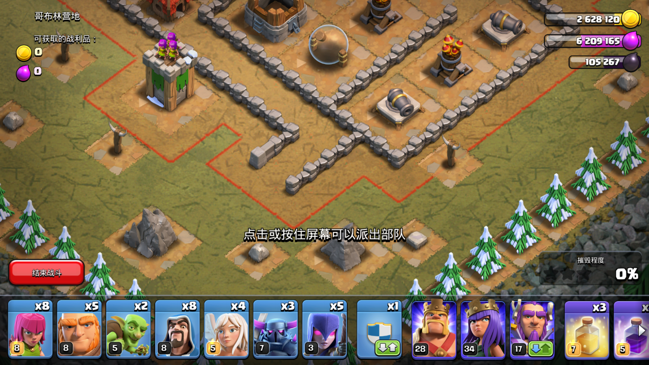 从之前的交锋就能看出哥布林相当狡猾,这种路径里肯定藏满了陷阱等着我们中招。要是派陆军进攻,先让几个哥布林探路踩掉陷阱,就能从左下方发起攻击了。这一关的防御建筑等级不算高,所以拿下三星完胜会很轻松。