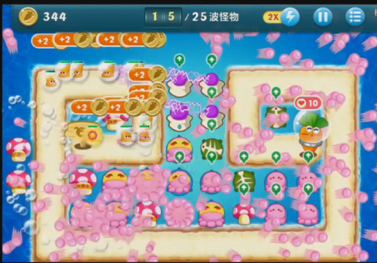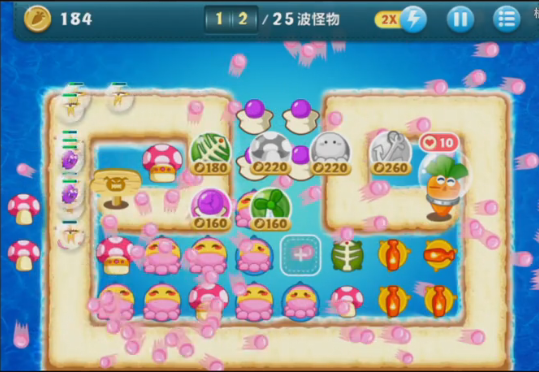 当十六波怪兽来袭后,玩家差不多能清理掉所有道具,此时可以用攒下的金币在怪兽出口处大量布置塔防。我当时选的是章鱼塔防,把它们都升到满级后,只要有怪兽出现,就会放出超多小章鱼发起攻击,而且伤害相当可观。