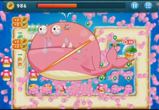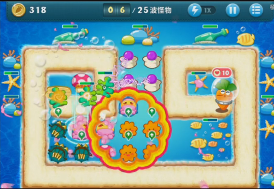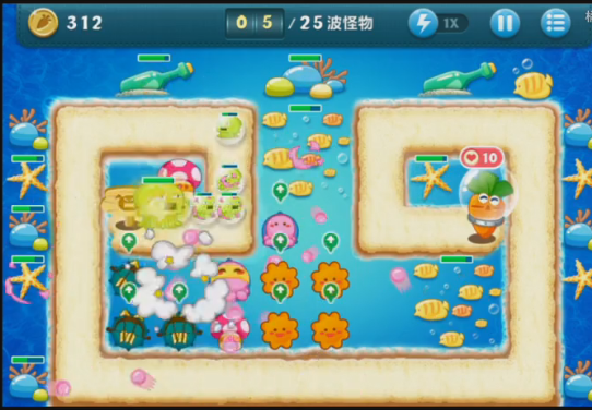在放置好第一个章鱼塔防后,玩家就能在攻击怪兽的同时对周围道具发起攻击。海底关卡有个玩家特别喜欢的设定:几乎每个道具下方都藏着一座塔防,因此玩家清理道具时,既能拿到金币,又能获取新的塔防。到了游戏后期,怪兽的攻击力会提升,这时候玩家完全可以通过布置更多塔防来应对这些可爱的怪兽。