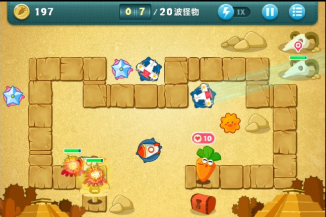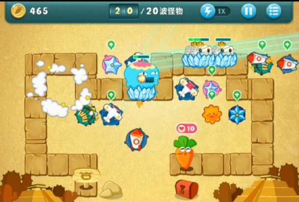2. 拥有2级玩具飞机后,应对前几波怪物就没什么难度了。每波怪物来袭的间隙,我们得清理一下上方的宝箱道具,这样能拿到一个玩具飞机和冰冻星星。冰冻星星是减速类炮塔,把它放在玩具飞机前面是很合理的布置。